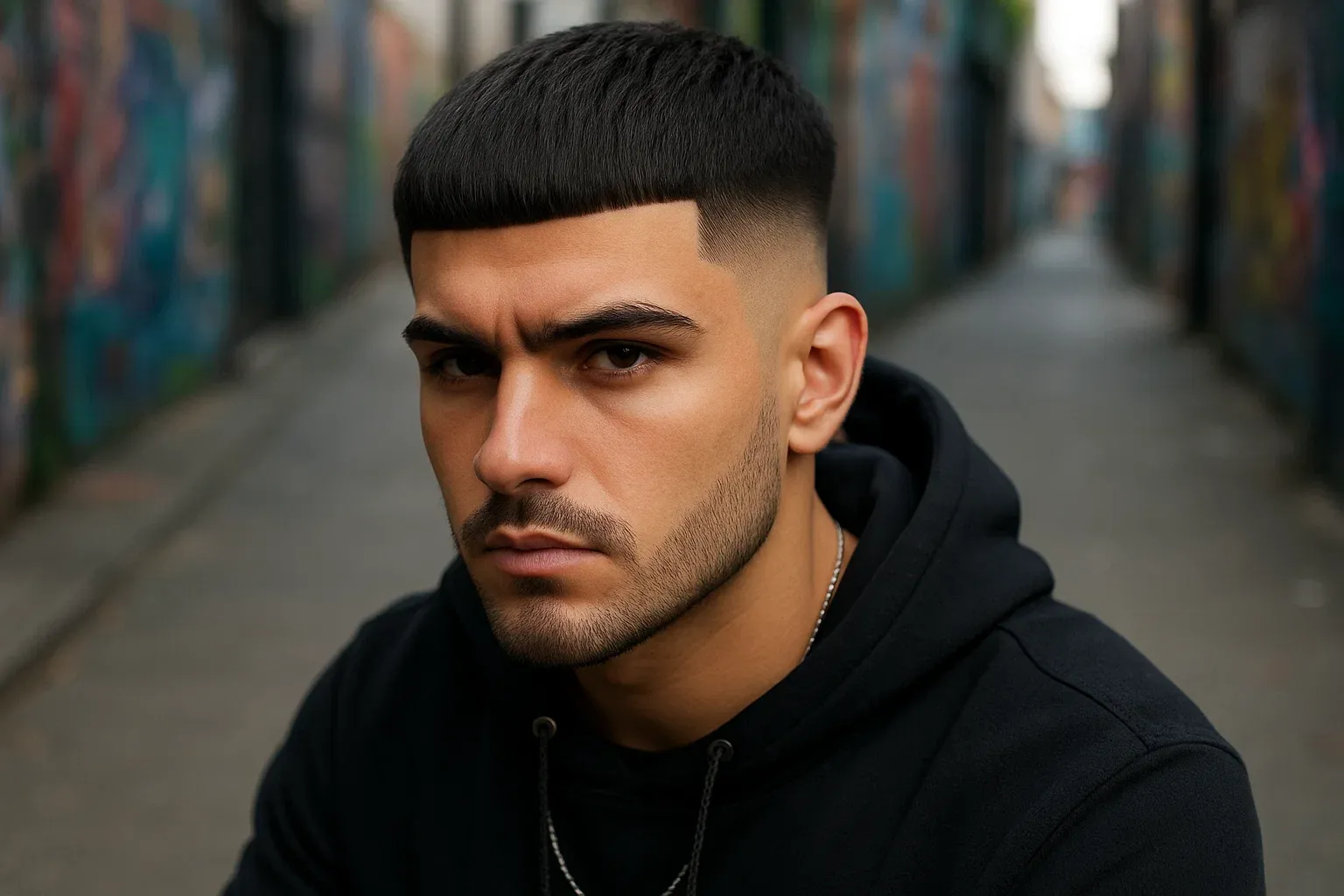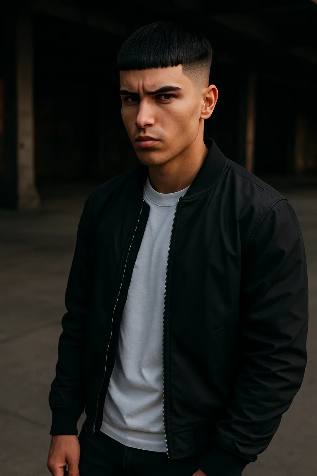 The Mid Fade Edgar Haircut takes the fading technique higher up the sides of the head, typically starting the fade around the temple area. This variation creates a more dramatic contrast between the long fringe area and the faded sides, resulting in a bolder, more contemporary appearance. The fade usually begins about halfway up the sides of the head and creates a smooth transition from the fuller top section to very short or even skin-level hair at the bottom. The mid fade Edgar is particularly effective for those with round or square face shapes, as the higher fade helps elongate the appearance of the face while the straight fringe provides balance. The styling possibilities with this cut are extensive, allowing for both sleek, combed-forward looks and more textured, messy interpretations. Maintenance for this style typically requires visits to the barber every 2-3 weeks to keep the fade looking crisp and the fringe properly trimmed.