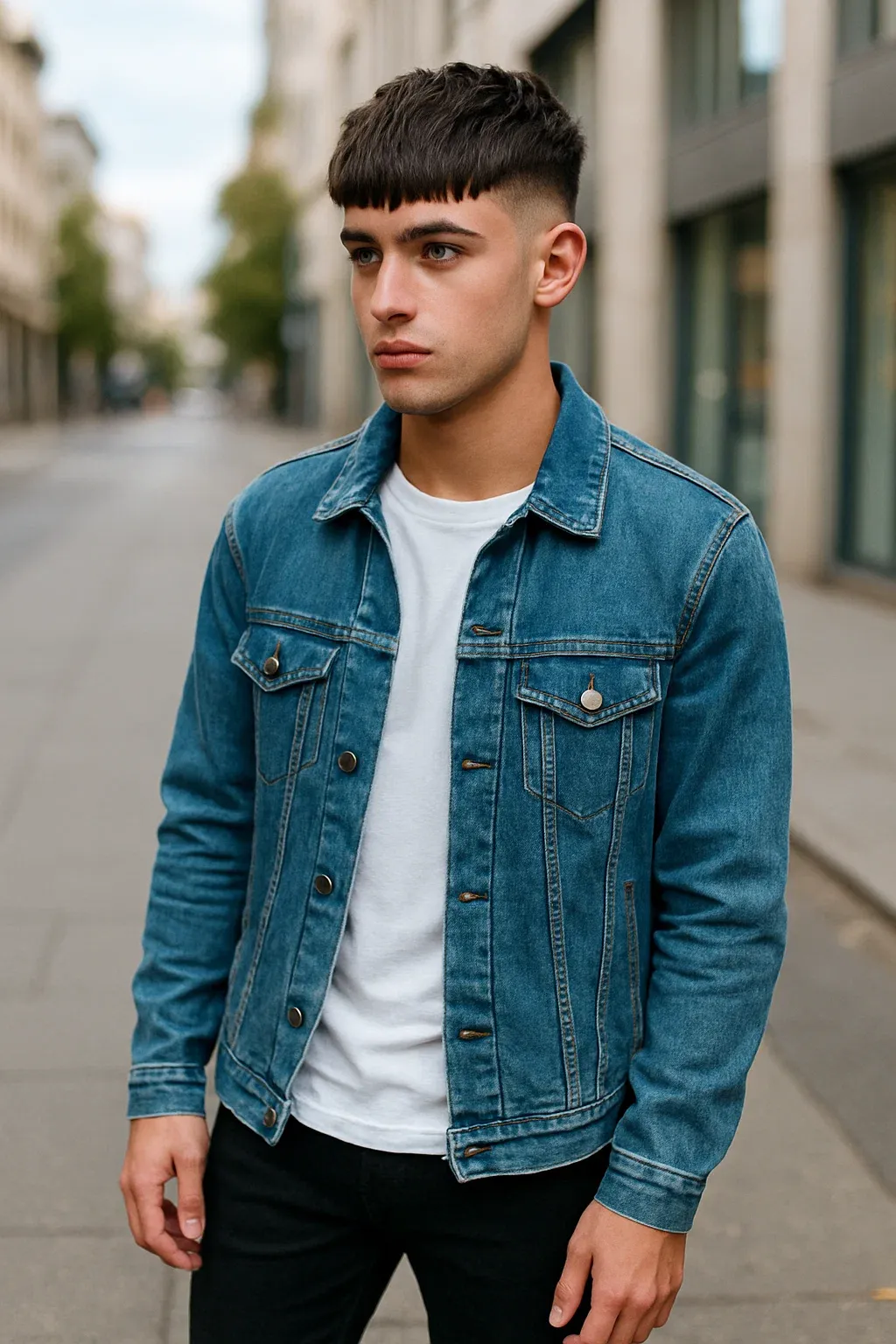 The Classic Edgar Haircut represents the original and most traditional version of this distinctive style. This variation features a perfectly straight, blunt fringe that sits evenly across the forehead, typically falling just above the eyebrows. The sides are cut short with a basic taper, creating a clean contrast without the modern fade techniques seen in other variations. The top section maintains uniform length throughout, usually ranging from 2 to 3 inches, which provides enough weight to achieve that signature straight-across look. This classic approach emphasizes the geometric nature of the cut, with clean lines and minimal texturing. The back is typically tapered to blend seamlessly with the shorter sides, maintaining the focus on the dramatic fringe area. Barbers often use clipper-over-comb techniques and precise scissor work to achieve the sharp lines that define this timeless version.