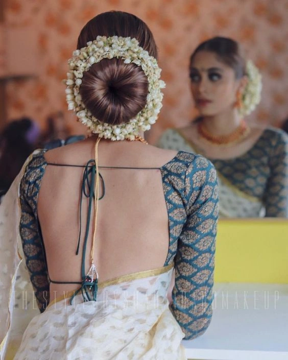Gajra hairstyle with bun: Classic. Hair is tied into a bun (high, low, or side) and the string of garland is wrapped around or pinned along the bun. E.g., bun with gajra hairstyle for saree.