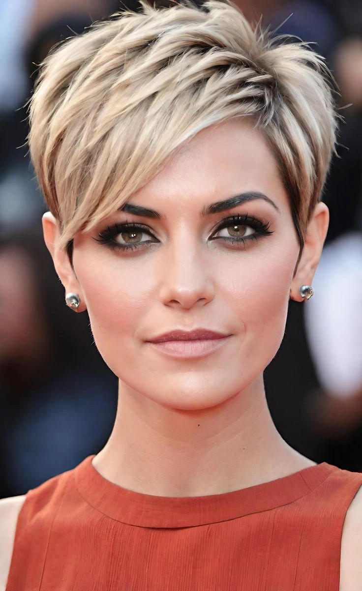 A: It’s an inverted bob with longer front layers, shorter spiky back, and chunky brassy highlights – the ultimate “manager” magnet.