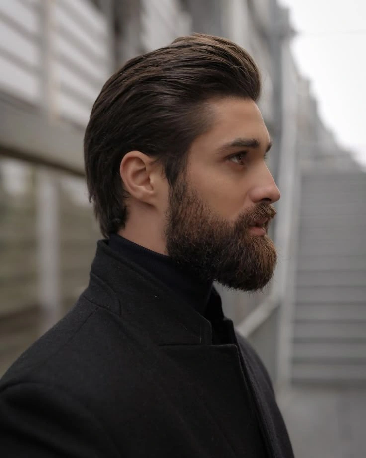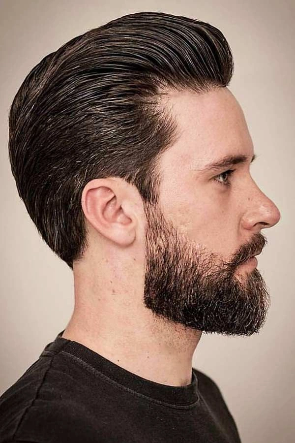 This style combines elements of the classic side part with pompadour volume. The hair is swept to one side with height at the front, creating an asymmetrical look that’s both sophisticated and interesting.