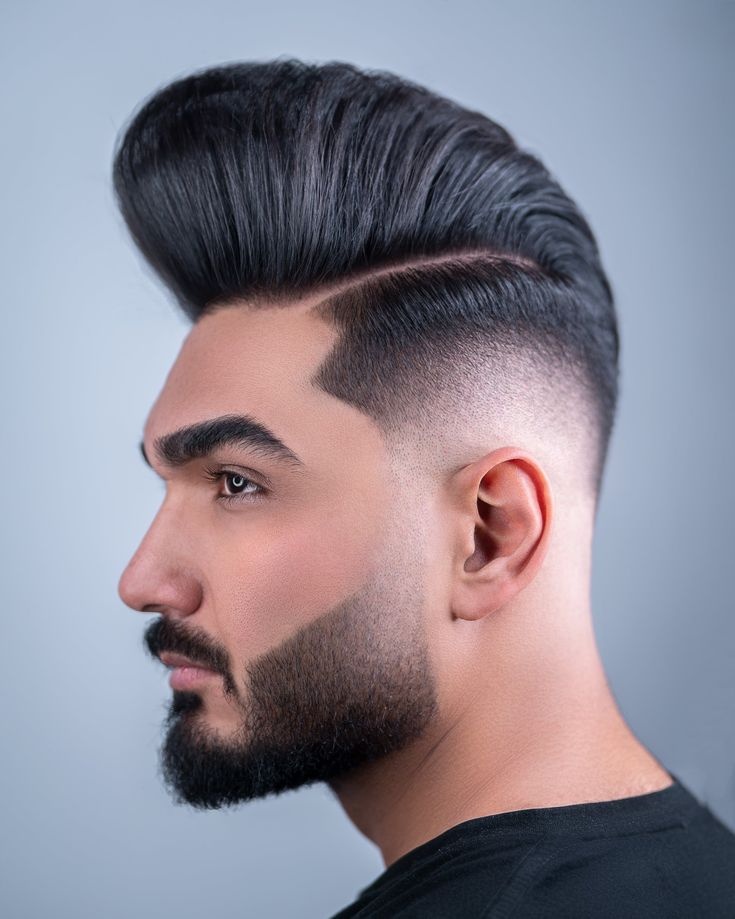 • Skin-Fade Pompadour: Sides are faded right down to the skin; top remains bold and voluminous. Clean, sharp, modern.