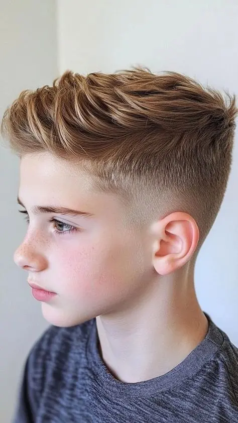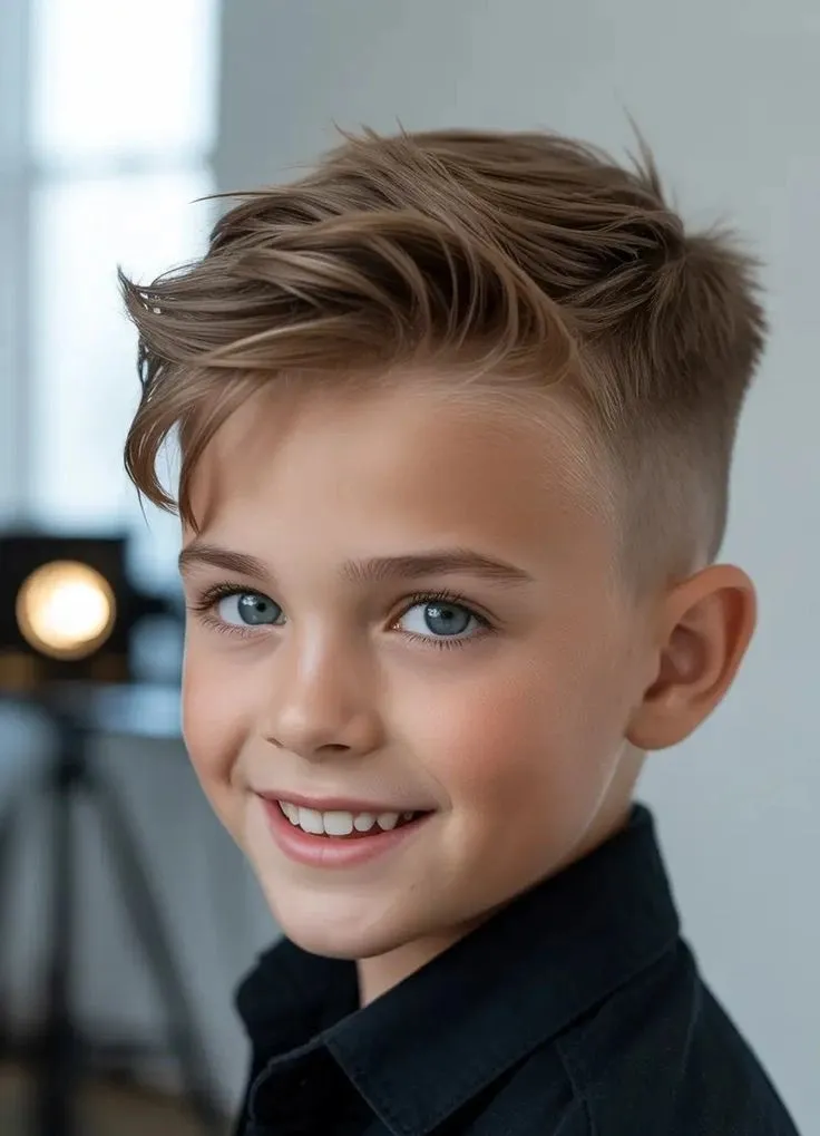The quiff has been around since your grandpa’s generation, but the 2025 version is less greaser and more influencer. This boys hairstyle combines volume at the front with shorter sides, creating that swept-up, slightly pompadour-esque look.